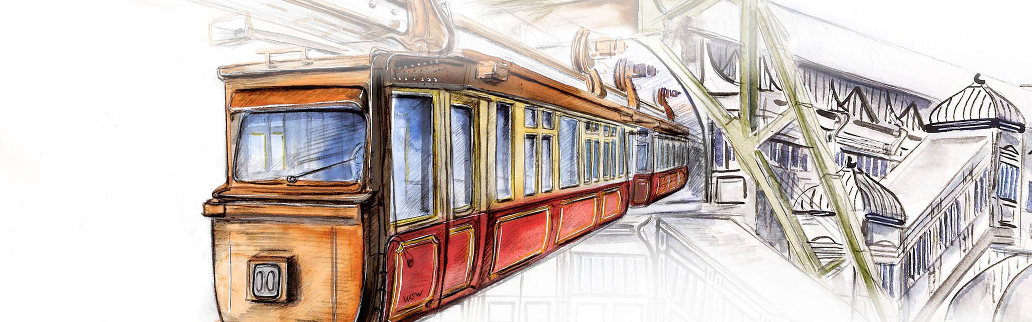 Unsere Stadt verfügt, damals wie heute, über eine Vielzahl ungewöhnlicher Verkehrsmittel. Das ist weltweit einzigartig und somit ein schöner Aufhänger für dieses Plakat. Neben den Hauptmotiven finden sich Karten der Strecken im Hintergrund.