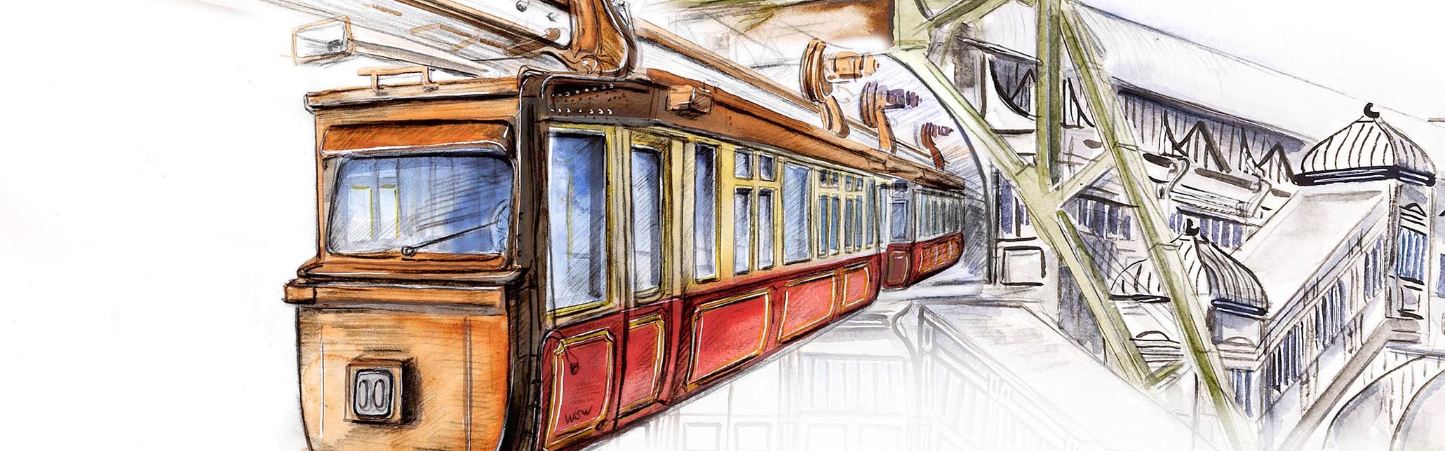 Ab Dezember des Jahres 2015 wurde die über vierzig Jahre alte Generation der Wagen durch neue Züge ersetzt. Das Poster "Die Geschichte der Schwebebahn" zeigt die wichtigsten Wagentypen von Beginn an, und einige weitere Motive rund um Wuppertals liebstes Wahrzeichen. Das Interessante an diesem Poster sind die verschiedenen Designstile, die die Schwebebahn während Ihrer Entwicklung durchlaufen hat.